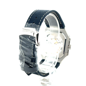 The modern, "casual chic" style is enhanced by a strap in navy blue composite material with fabric pattern.