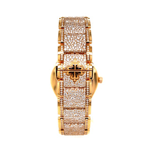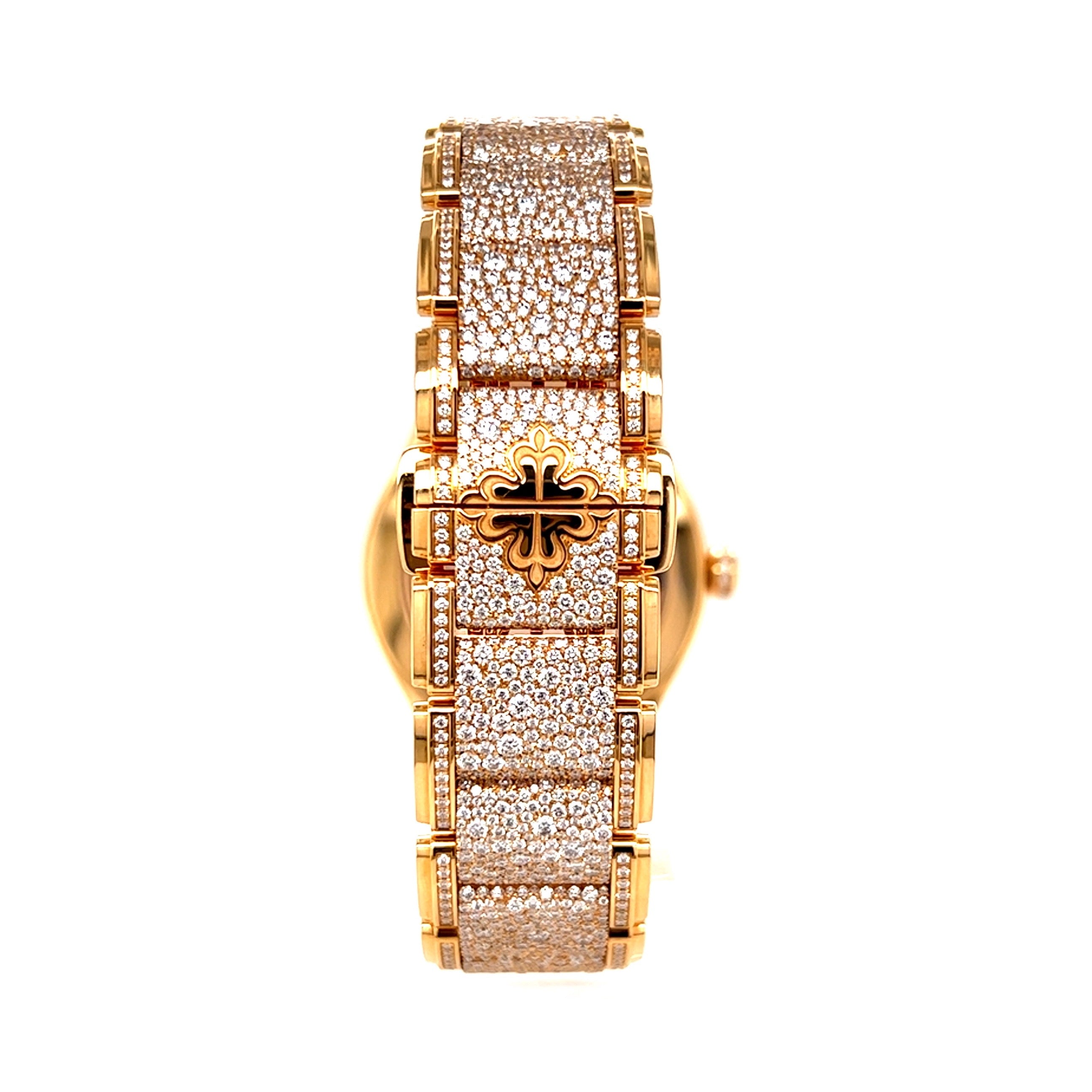 A timeless yet contemporary new face is introduced to the Twenty~4 collection in a medium-format manchette quartz version. The former Roman numerals are replaced with applied Arabic numerals in gold while diamond markers are replaced with trapeze-shaped gold markers. Featuring the rose gold model with diamond dial and bracelet.