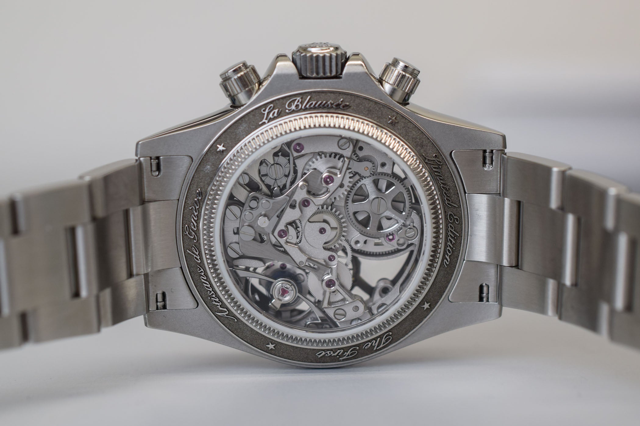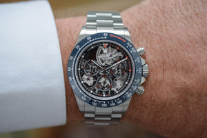 The Blausee Challenge is the encounter between our craftsmen and a watch enthusiast who wanted his timepiece to gather the essential values of traditions and watchmaking while capturing the unique shades of a place that resonates with him. The serenity that prevails in Blausee has inspired us a return to origins: a skeleton version of the Rolex Daytona with a manual winding in steel and rose gold. The steel version was a delicate echo to lake Blausee, while the gold rose is a subtle tribute to the autumnal hues of the place.